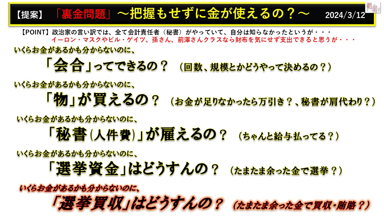 【結論】お金の管理をしていない事は100%あり得ない、本当に知らないと言うのであれば、逆に秘書が何をやっていても政治家は何も分からない!(次の提案につながる)