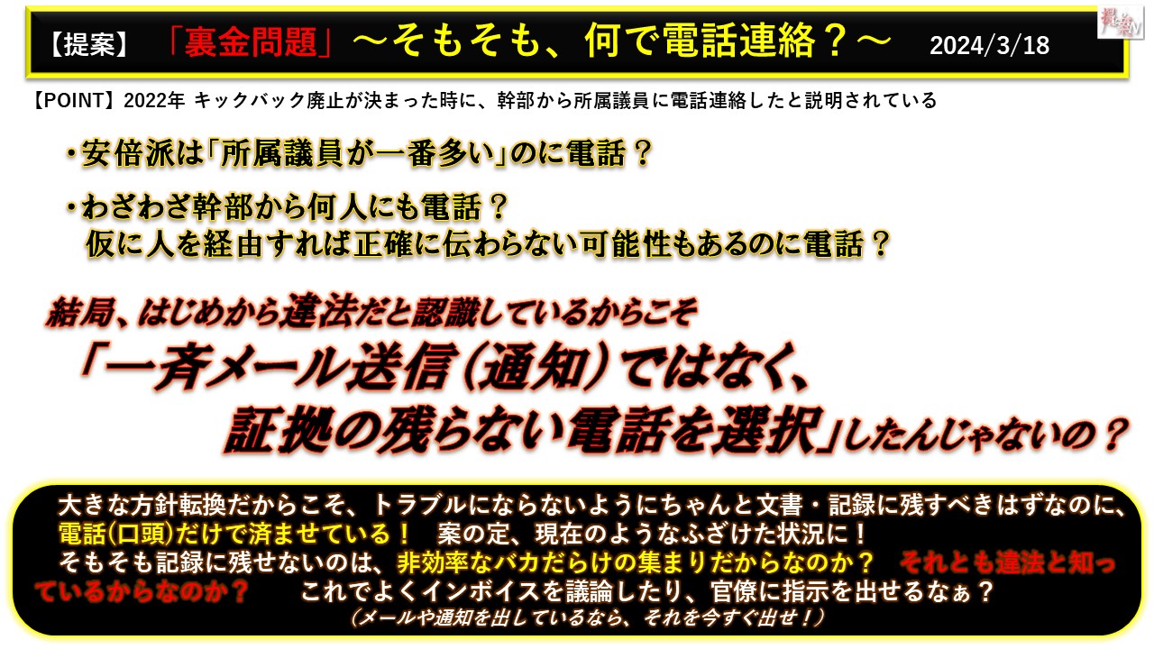 【結論】犯罪・違法だと知っているからこそ、「証拠の残らない電話連絡」でキックバック廃止を伝えたのではないか?20240318 裏金 そもそもなんで電話連絡