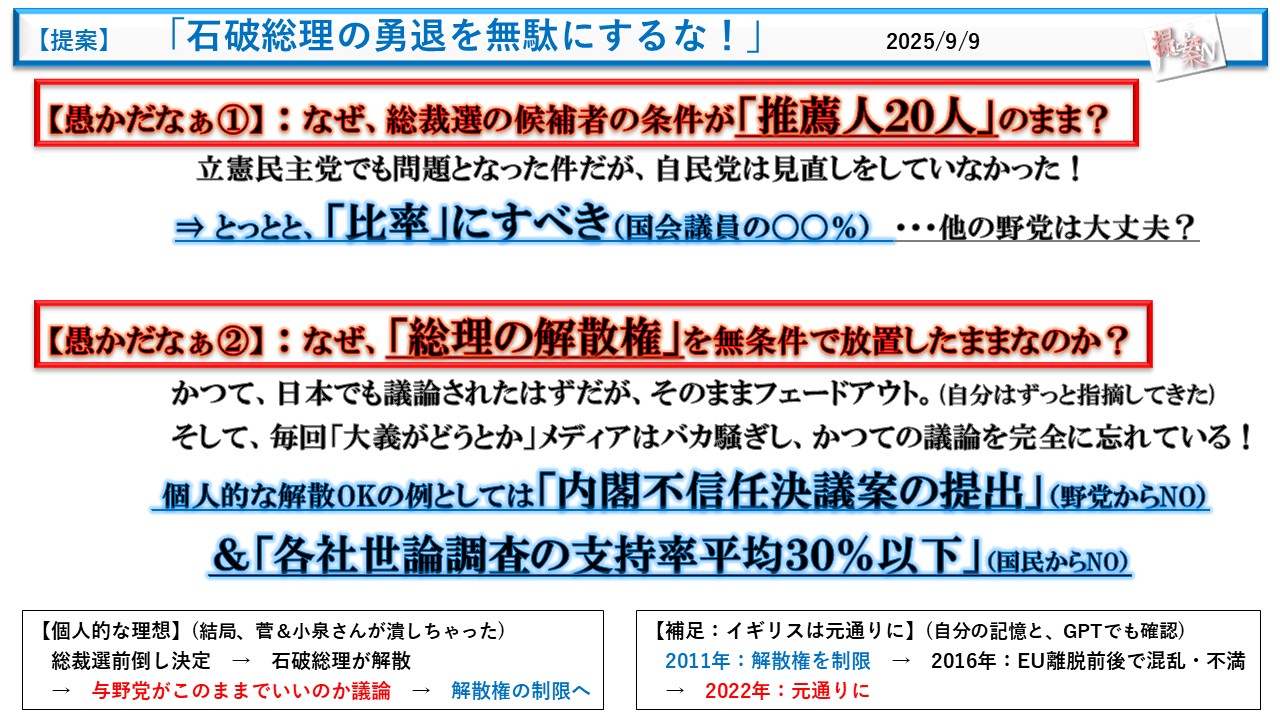 あえて「勇退」という表現にさせてもらいましたが、これから自民党の総裁選が始まる中で、ありきたりな論点とは別に、今回提案する項目を指摘するか注目したいと思います!