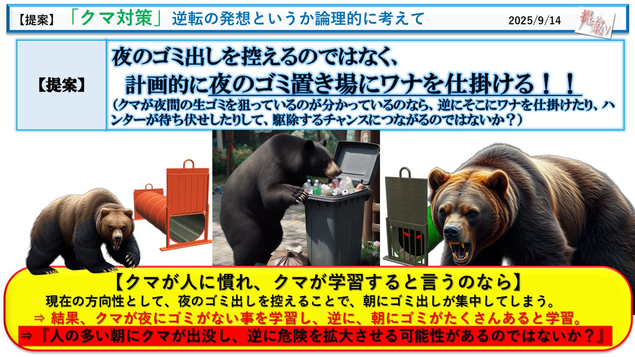 クマが人に慣れ、学習すると言うなら、朝にゴミ出しが集中すると、それを学習し、朝にクマが出没する可能性が増えるだけではないのか? そうしたら、朝の方が人間の数・活動が多いので、人的被害も増えてしまうのでは?