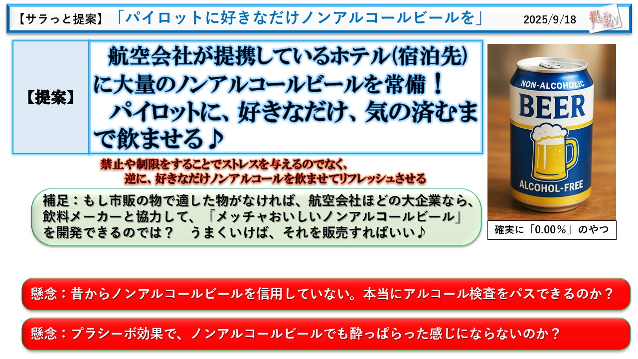 サラっと提案)「パイロットに好きなだけノンアルコールビールを」