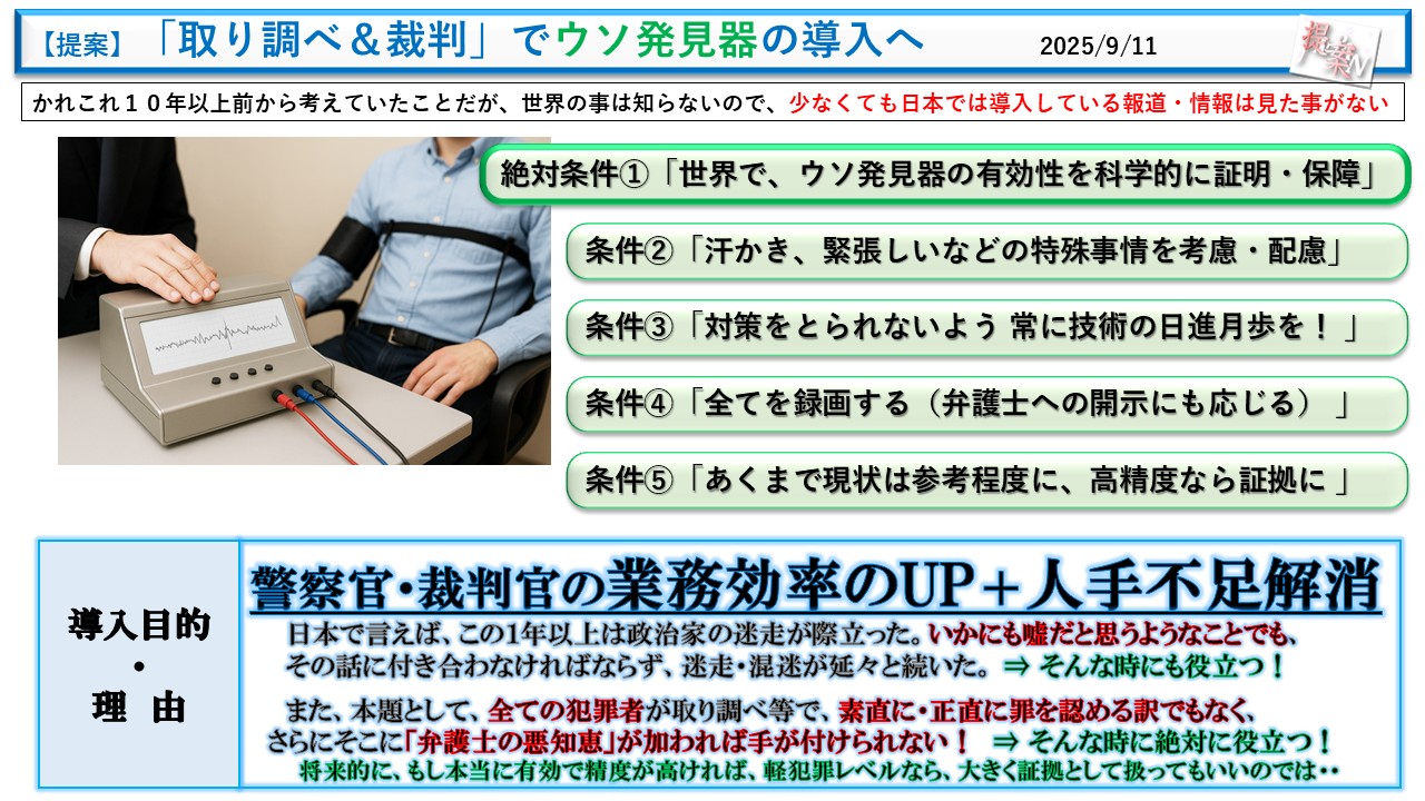 「ウソ発見器」の有効性が、世界で科学的に証明や保障がされていること。 まずこれが全てで、そもそもあまり信用できない方法なのであれば、これで提案は終了