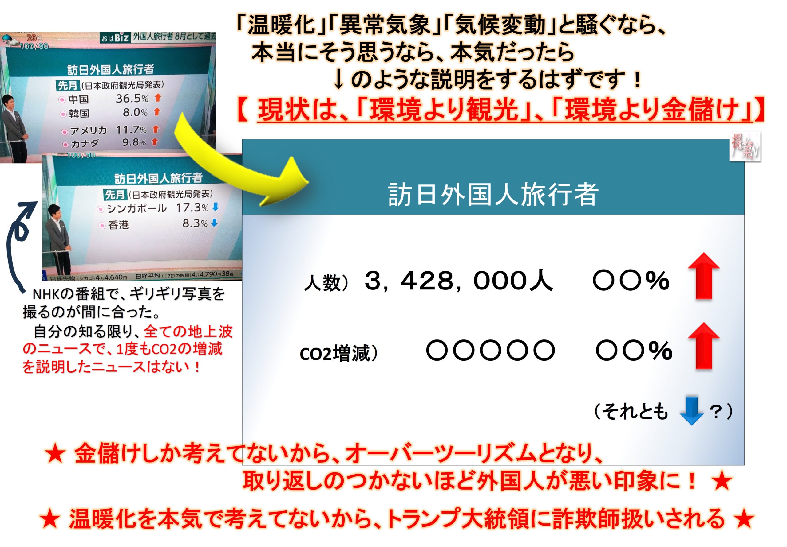 今回の指摘は単純で、飛行機がCO2をたくさん排出すると言いながら、外国人観光客が増えた話、金儲けの話(インバウンド・オーバーツーリズム)ばかりで、CO2が増えた減ったの話など1度も聞いた事がない!