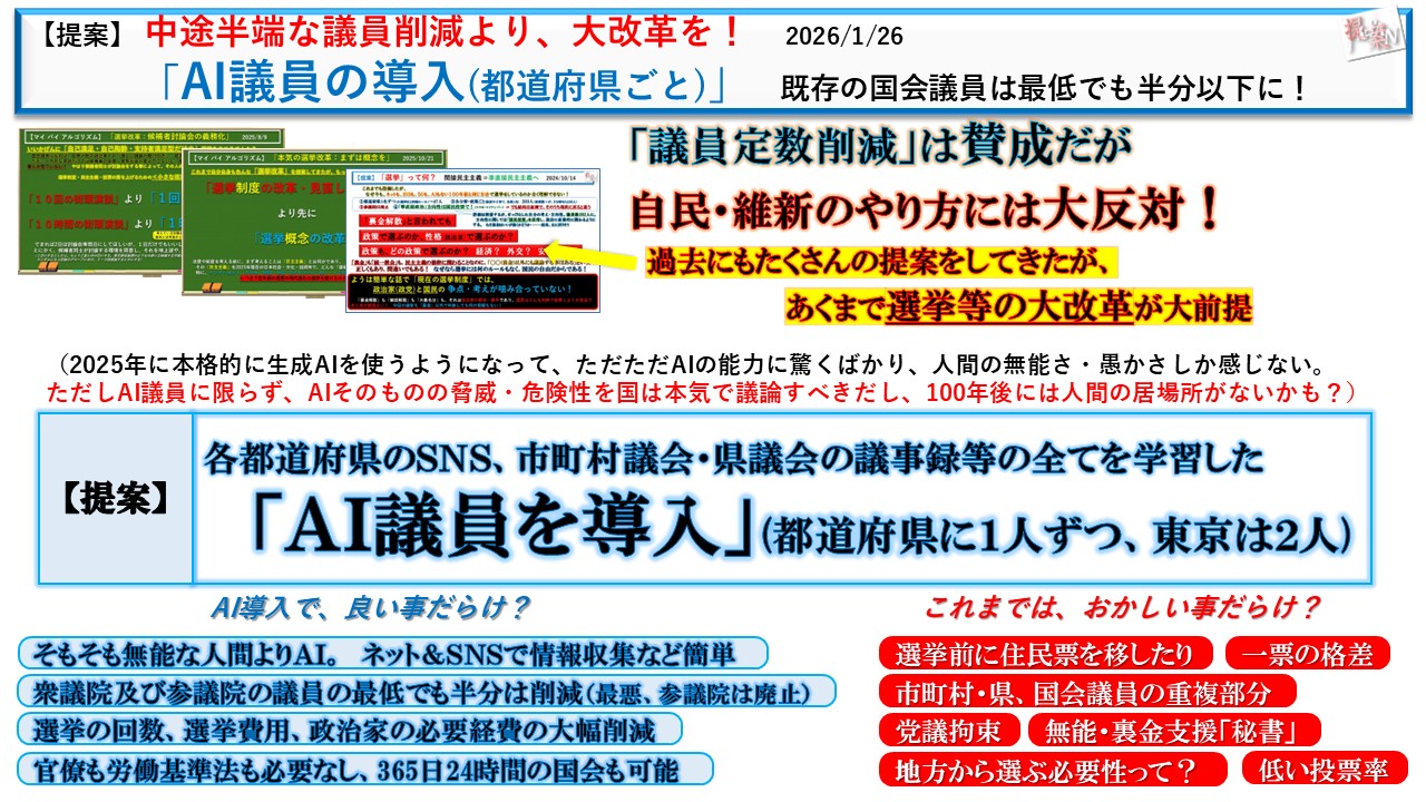 提案)中途半端な議員削減より、大改革を!「AI議員の導入(都道府県ごと)」