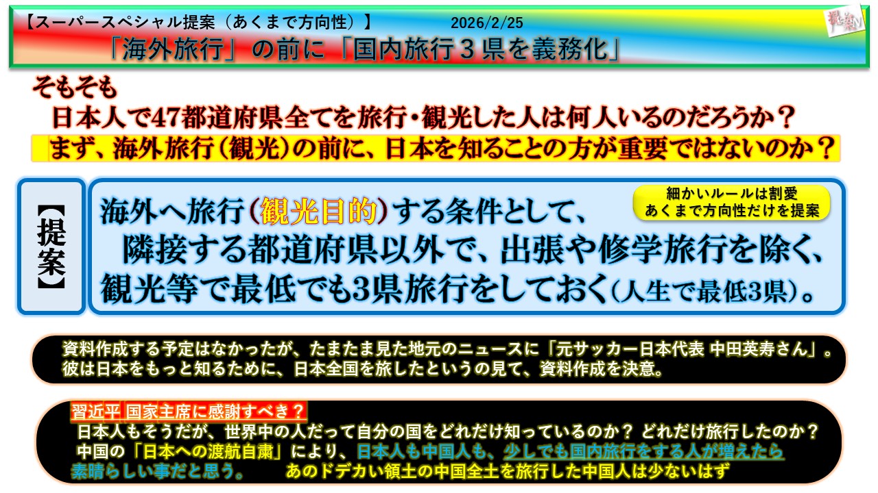 海外へ旅行(観光目的)する条件として、隣接する都道府県以外で、出張や修学旅行を除く、観光等で最低でも3県旅行をしておく(人生で最低3県)。