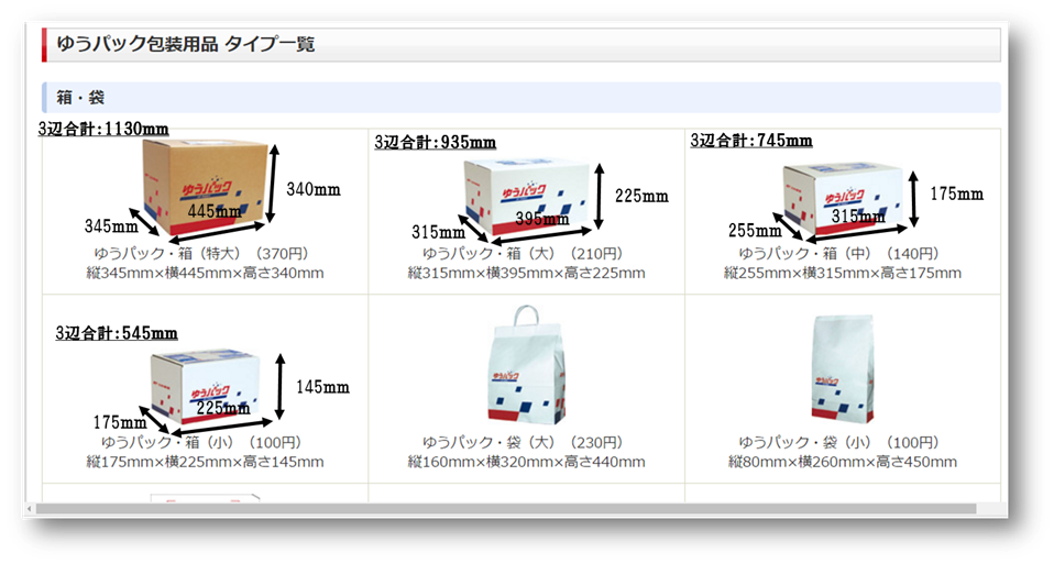 補足説明)段ボールの規格・サイズの説明はあるが、パっと見でわかづらい、また、料金計算しようと思ったら、3辺(縦×横×高さ)の合計値が必要になる