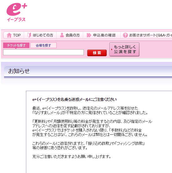 ◆詐欺メール 【注意喚起】詐欺・迷惑メールのお知らせ 2017年12月21日 minosanpo コメントする 先日、ショートメールで「詐欺メール・迷惑メール」がきたので、紹介します。 みなさんもご注意下さい! 連絡方法) 携帯電話のショートメール 内 容) 認証番号:1866。この番号を入力してください。番号の有効期限は10分です。イープラスより。 さ ら に) その後、非通知で電話もあった 【対策】 基本的に無視。ネットで同様の被害を検索。電話もかかってきたため、非通知を着信拒否に。 ※イープラスのホームページでも注意喚起しています