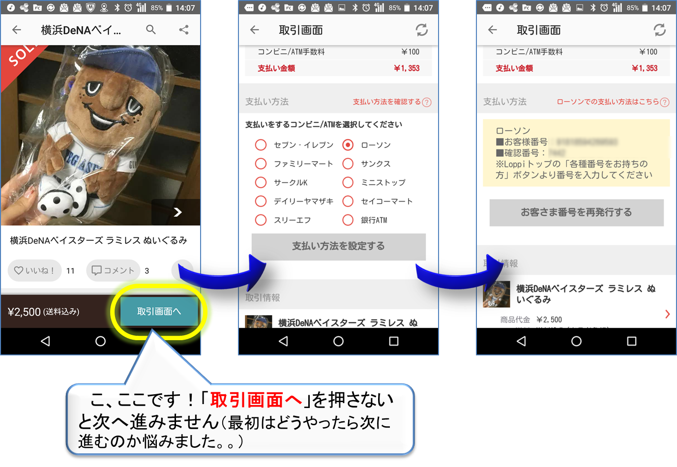 「取引画面へ」を押すことを忘れない事! ただ、それだけです。 あとは流れにそってスムーズにいきますが、最初は、購入したのに画面が変わらないなぁとか感じる人もいるかと思います(ちなみに、今回売上金とコンビニ支払の併用も簡単にできました)。