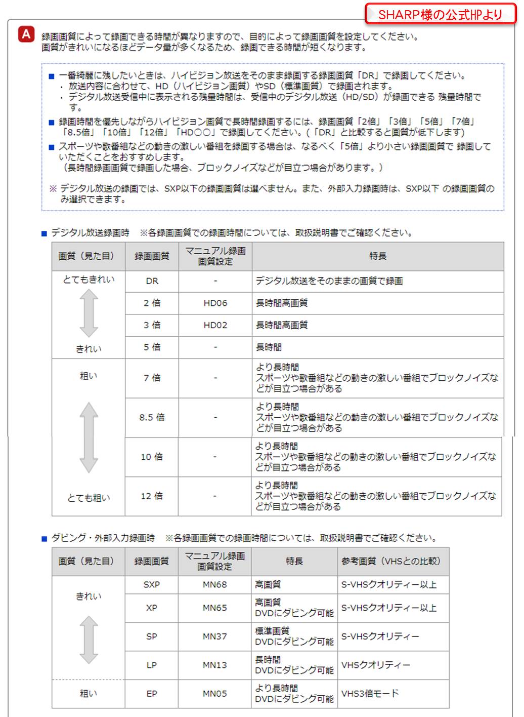 ■ 生活お得情報, ◆IT関係(生成AI関係も) ブルーレイレコーダー買い替え時の注意点②(ちなみにSHARP) 2019年10月31日 minosanpo コメントする ブルーレイレコーダー第2弾。 SHARPのBDレコーダーを10年くらい使ってて、ここ最近買い換えた・買い換える予定がある人は必見です!(ちなみに購入したのは、2B-C05BW1) ■今回は、ダブルチューナー編(+画質の種類) 「裏録」しようと思ったら・・・ ・・・ということで、当たり前のことですが、そのうち慣れれば、慣れた方が普通になるので、最初だけの苦労になります