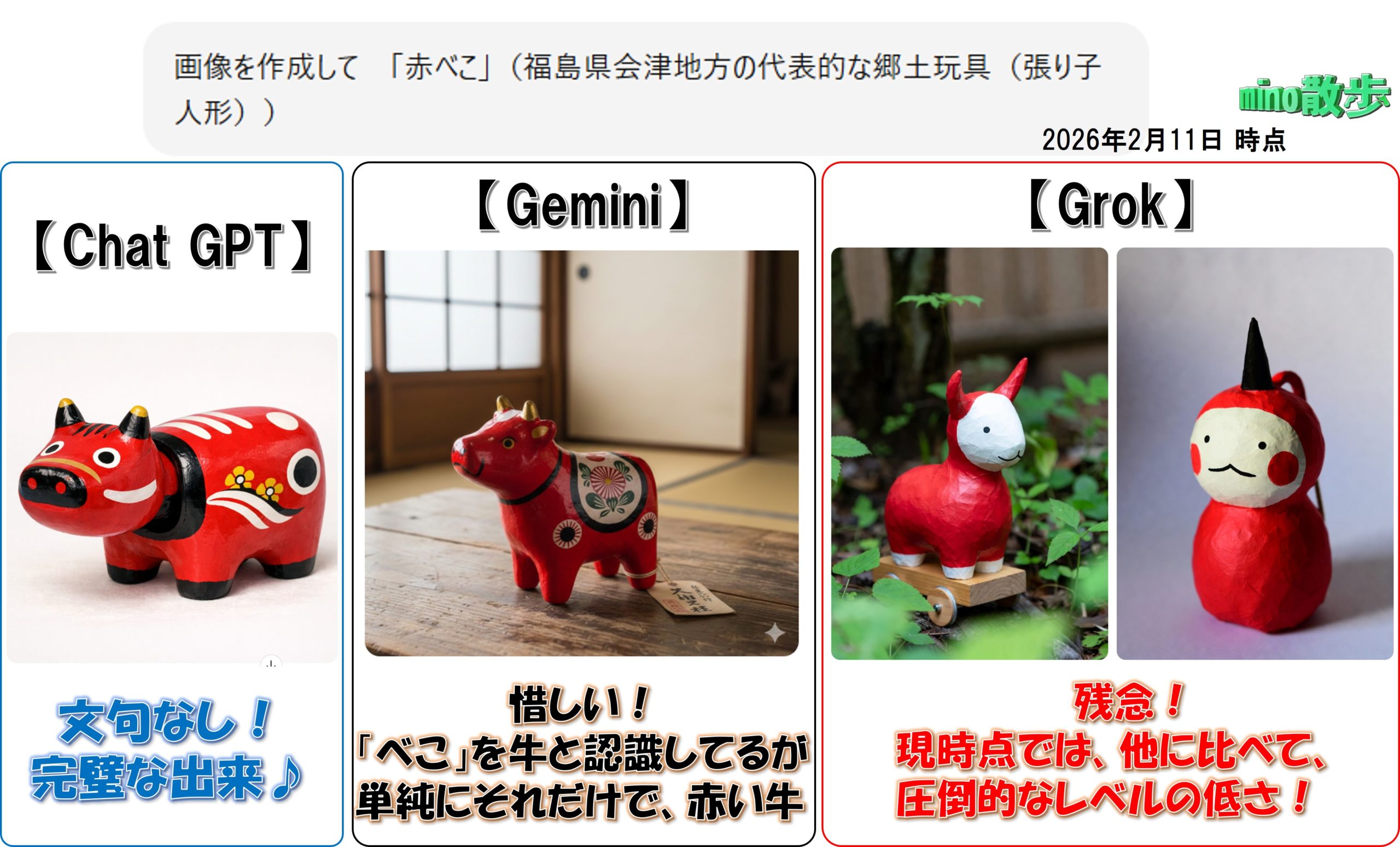 前回の「魚拓」のように、日本独特の言い方や伝統・工芸品などで、どこまで知能が高いかを判断できる。そこで「赤べこ」で比較してみた。2026年2月段階では、「GPT」がGeminiより、Grokよりも圧勝していると感じるが、最近は新しいCopilotも使いだして、回数制限のあるGPTを使う頻度が徐々に減っているような・・