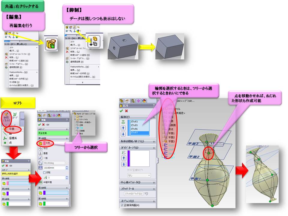 「SOLIDWORKS(3DのCAD)」についてのマニュアルですが、かなり前に作成したものなので、詳細な説明ができませんが、