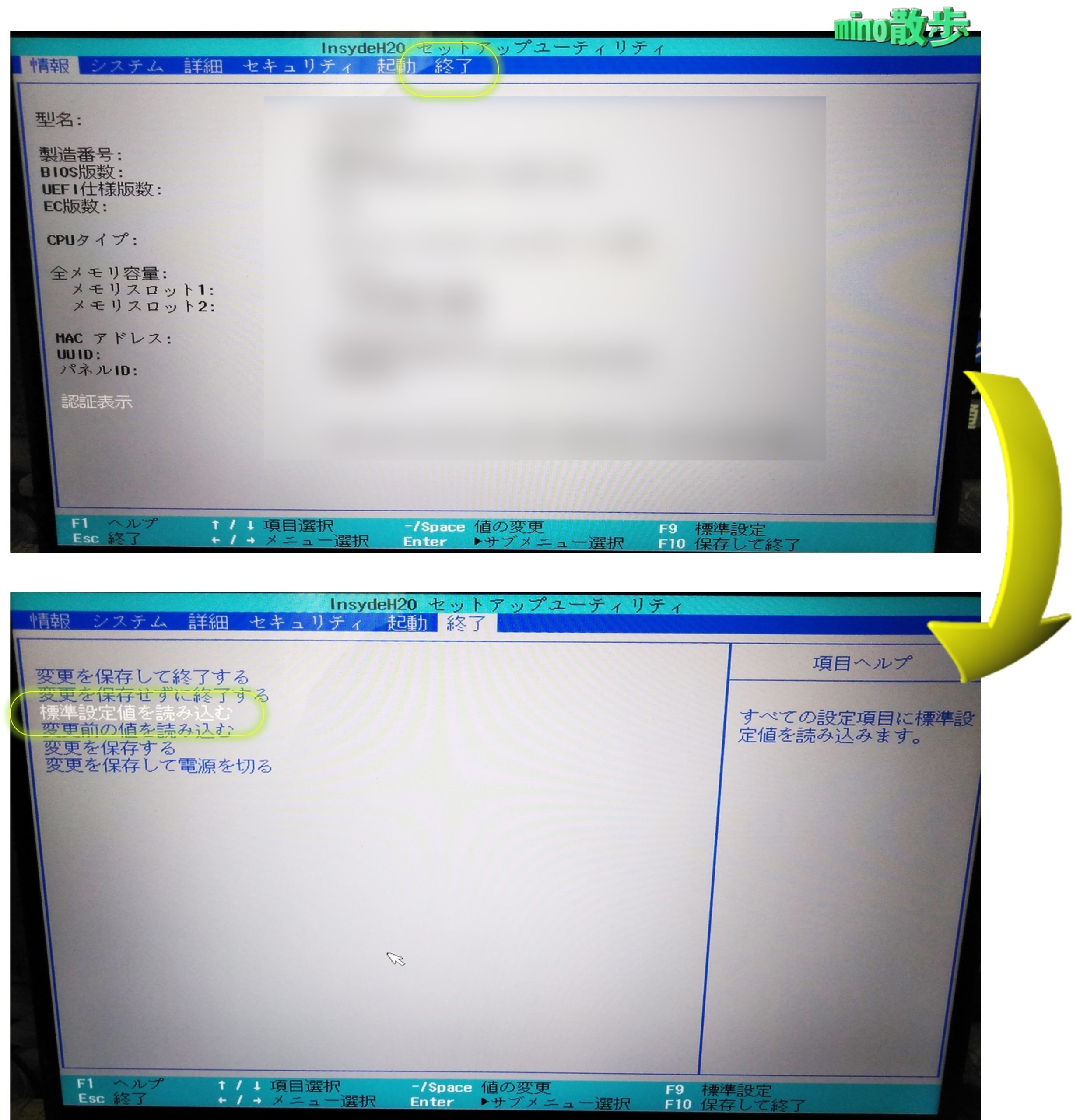 ※設定画面を追加(スクリーンショットもできないので、スマホで撮影。キーボードの矢印キーで「終了」に移動し、「標準設定値を読み込む」を選択)