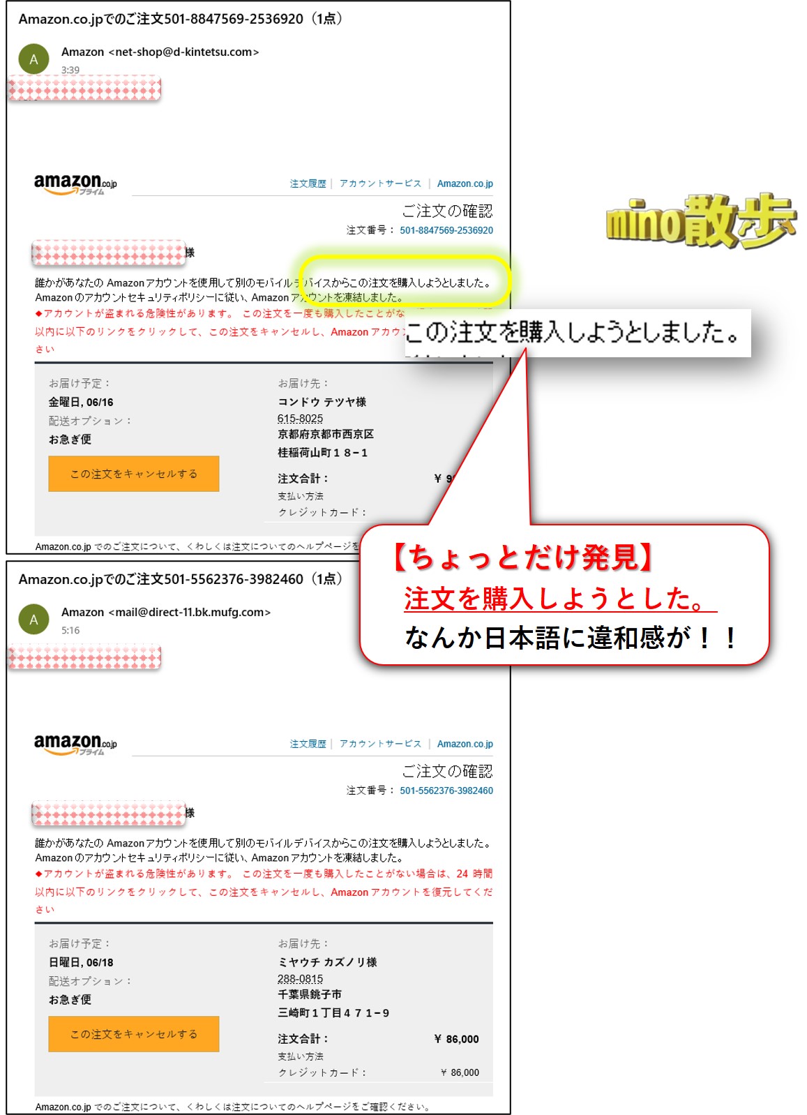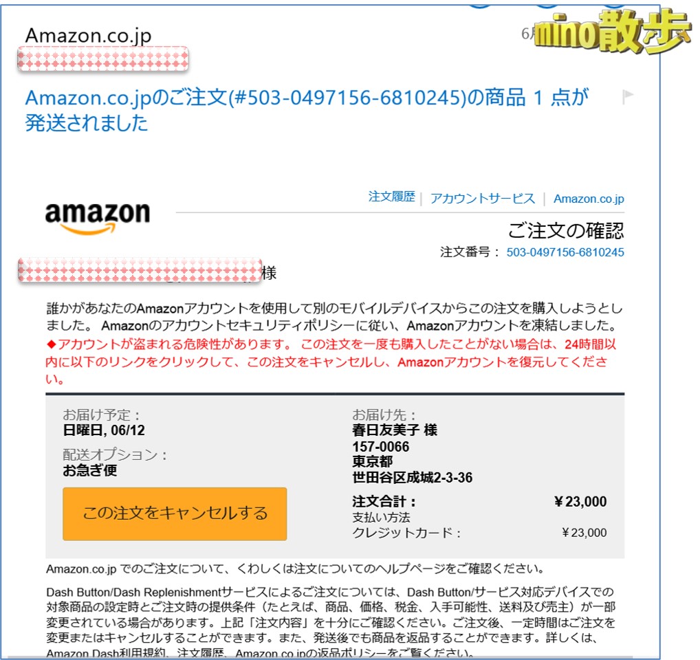 しかも、「実名や住所」、「金額の高さ」、「お急ぎ便」と、いつも以上に手が込んでいる。