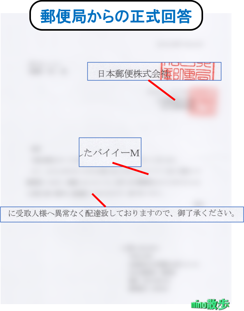 ・その後郵便局から正式回答があり、「到着予定日に問題なく配達」している事を確認