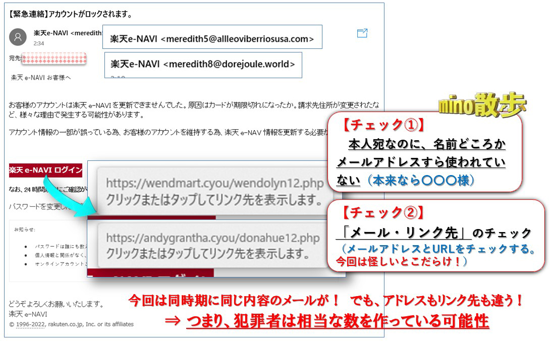 ※同時期に同じ詐欺メールがきたが、メアド・URLがしっかり違う!つまり犯罪者側は相当な数を作っている可能性も見えてくる