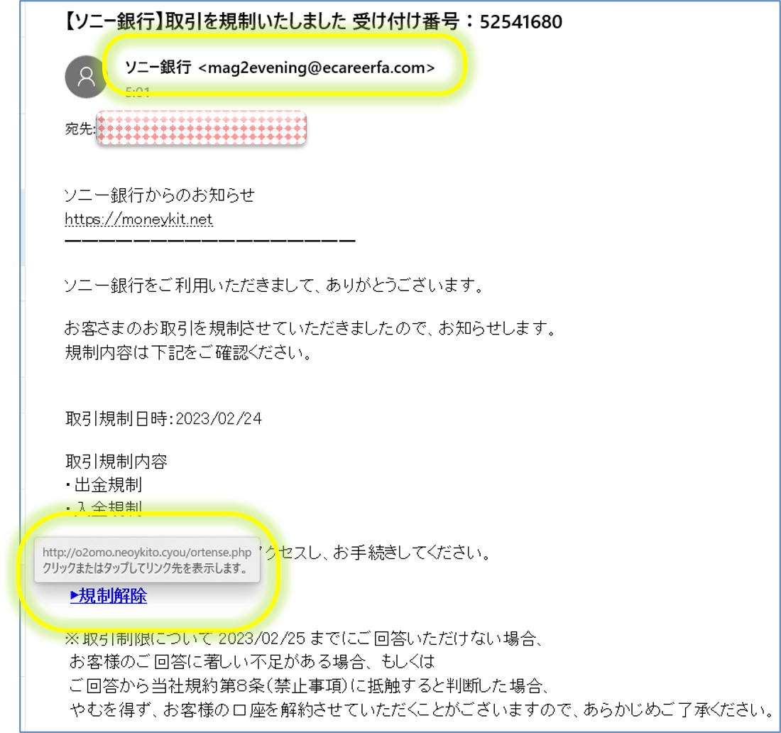 【ソニー銀行】取引を規制いたしました 受付番号