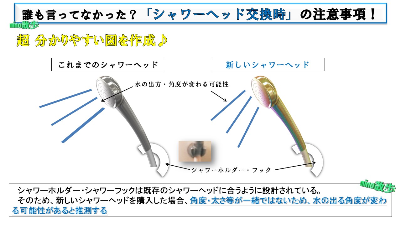 そして、シャワーヘッドを置くところ(シャワーホルダー、シャワーフック、シャワー掛具)の構造が、それぞれ異なり、既存のシャワーヘッドに合った形になっていること。