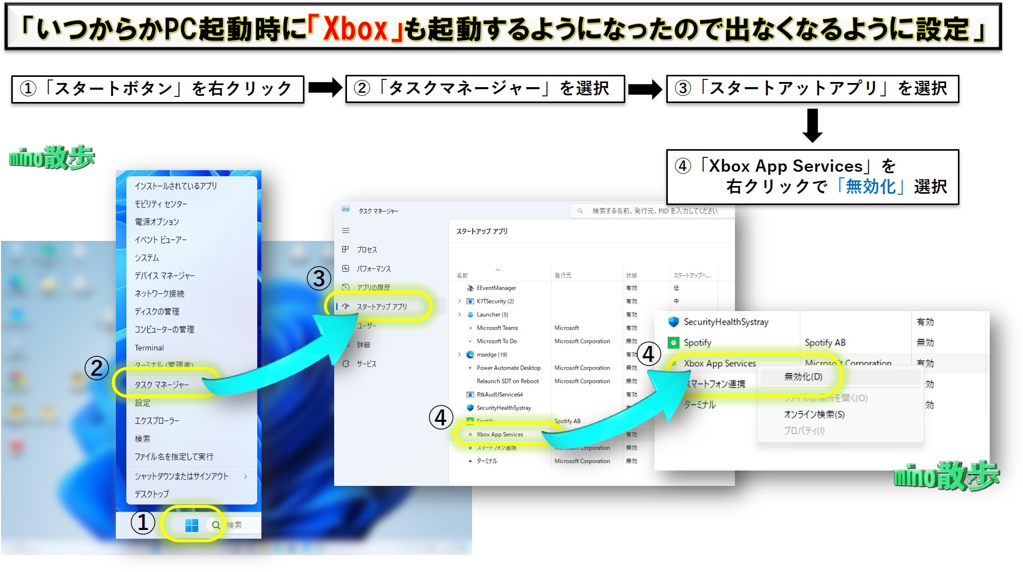 ⇒ ということで画像のように、「スタートボタン」からはじめ「Xbox App Service」を無効化で設定ができます。