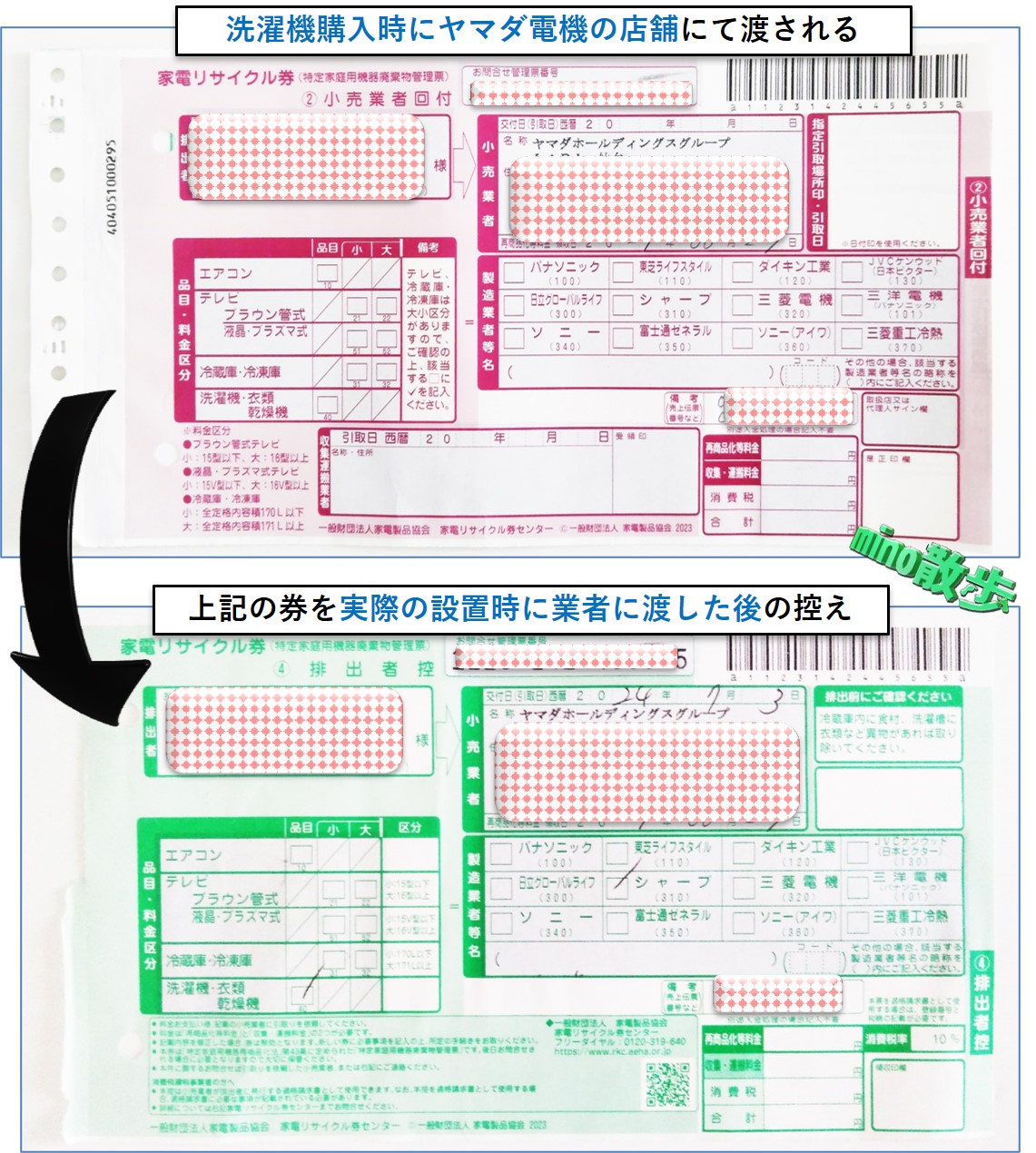 →「家電リサイクル券」の伝票を渡し、「排出者控え」を受け取る