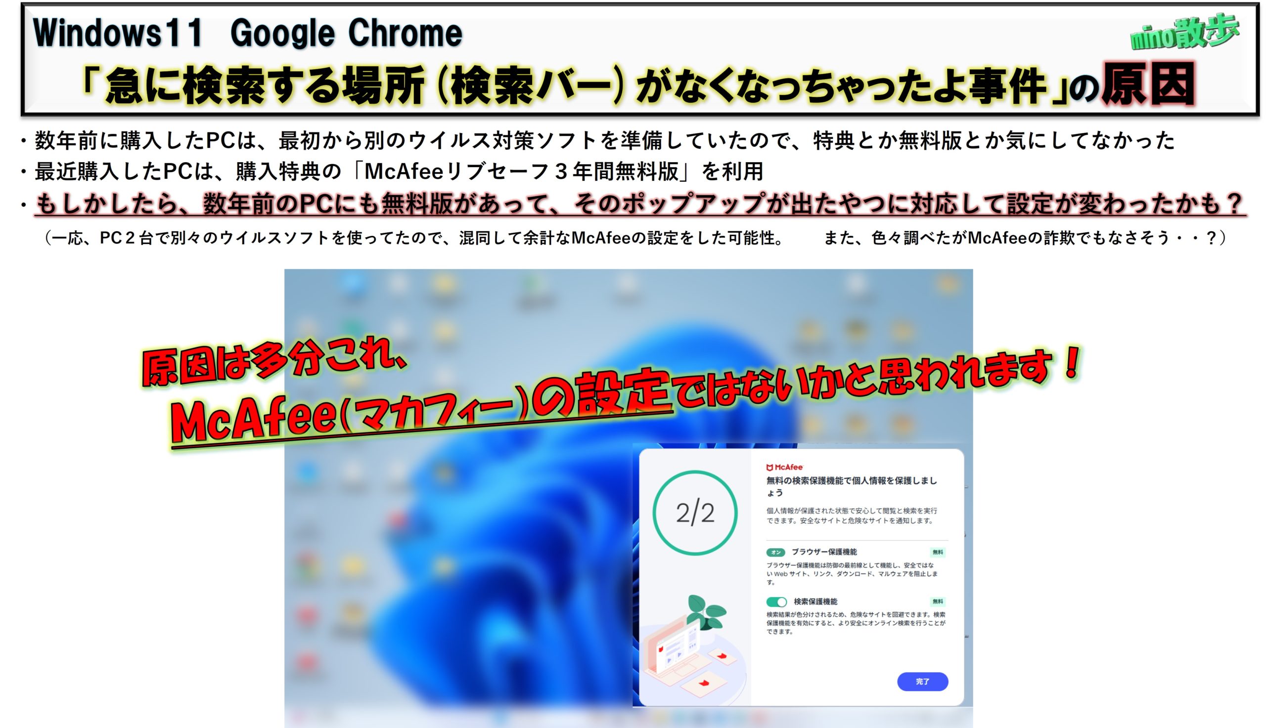 ほぼ「McAfee(マカフィー)」の設定」が原因だと思われる。
