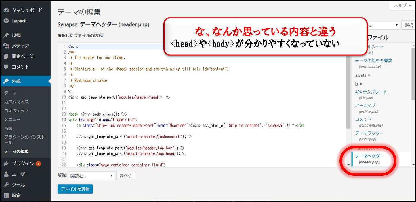 グーグルの設定上必要なので、<head>タグ探しをしていたのですが、以前ネットで調べたheader.phpの中を探しても見つかりません。